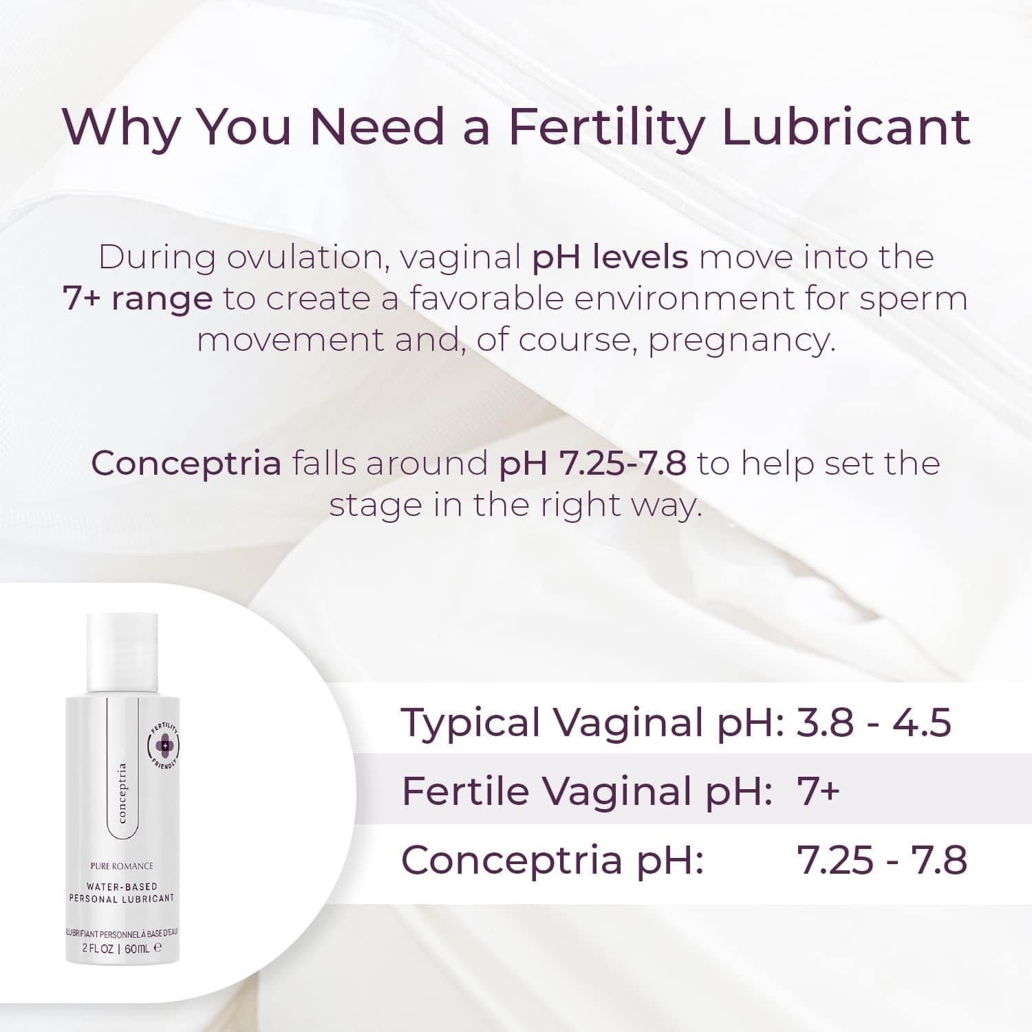 When you’re trying to conceive, opt for a lubricant with the right pH balance. While typical vaginal pH levels falls between 3.8 and 4.5 (i.e. slightly acidic), optimal pH levels for sperm viability fall between 7 and 8.5 (i.e. an alkaline environment). During ovulation, vaginal pH levels move into the 7+ range (aka become more alkaline) to create a favorable environment for sperm movement and, of course, pregnancy. Conceptria falls around pH 7.25-7.8 to help set the stage in the right way.